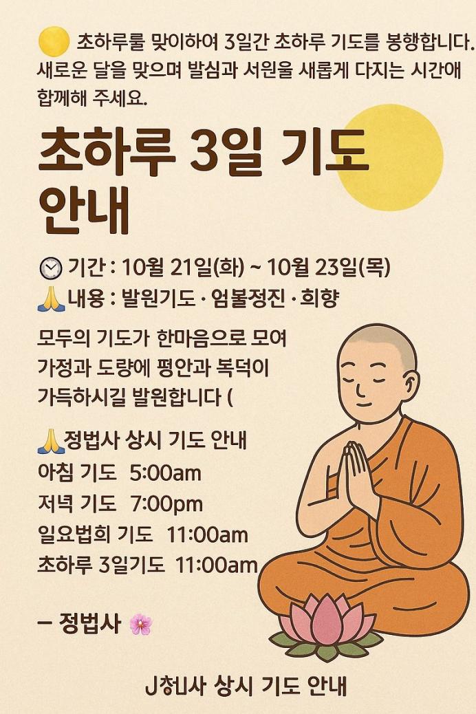 다가오는 초하루를 맞이하여 3일간 초하루 기도를 봉행합니다.새로운 달을 맞으며 발심과 서원을 새롭게 다지는 시간에 함께해 주세요.기간: 10월 21일(화) ~ 10월 23일(...