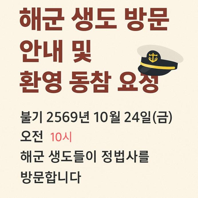 불기 2569년 10월 24일(금) 오전 10시,해군 생도들이 정법사를 방문합니다. ⚓우리 도량에 찾아오는 귀한 손님들을따뜻한 마음으로 함께 맞이해 주시길 바랍니다.이...