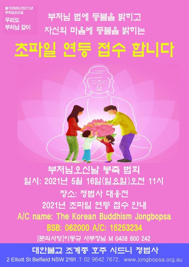 | 부처님오신날 연등 접수 합니다. | 공지사항[일반] | 05/09/2021 | 135 |