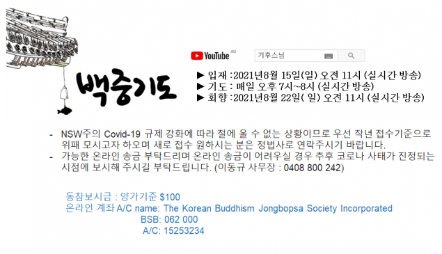 동참보시금 : 양가기준 $100 NSW주의 Covid-19 규제 강화에 따라 절에 올 수 없는 상황이므로 우선 작년 접수기준으로 위패 모시고자 하오며 새로 접수 원하시는 분은 정법사로 연락주시기 바랍니다.
