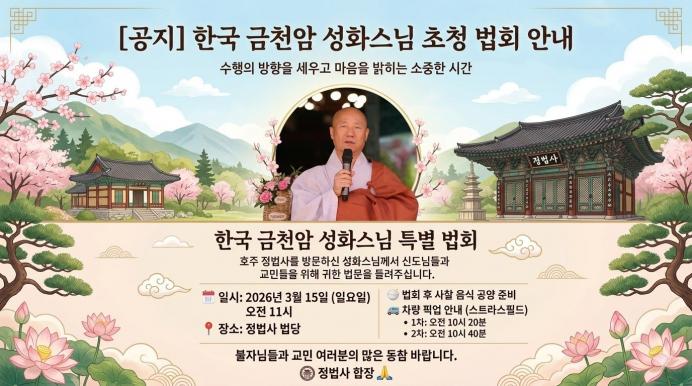 | [정법사 일요법회 후기] 한국 금천암 성화스님 초청 법회 | 공지사항[일반] | 21/03/2026 | 501 |